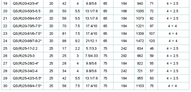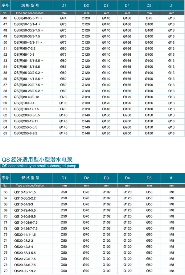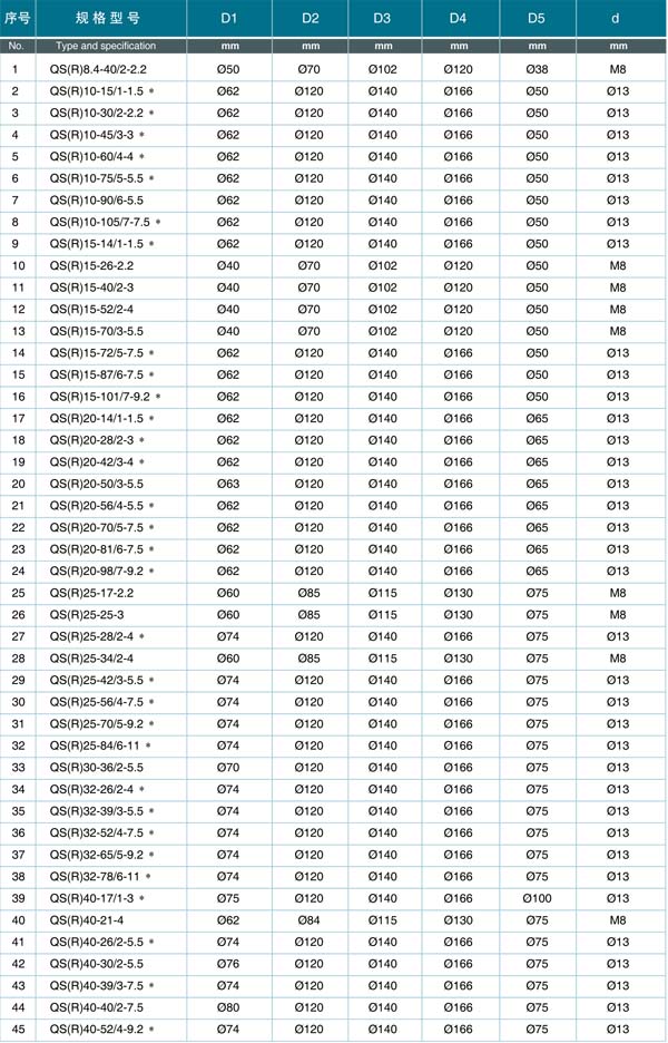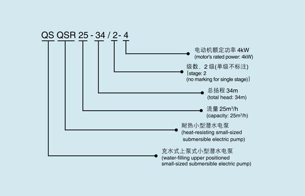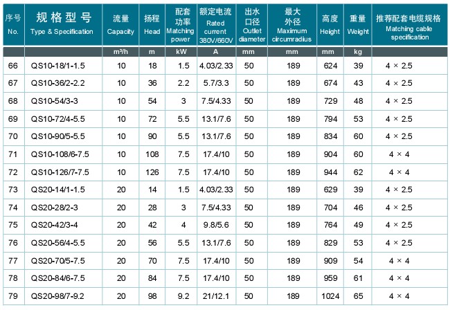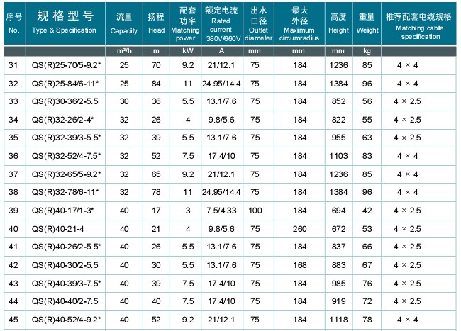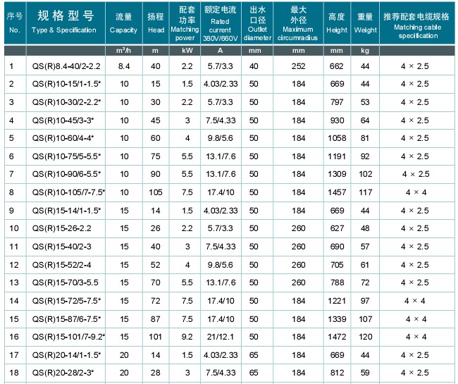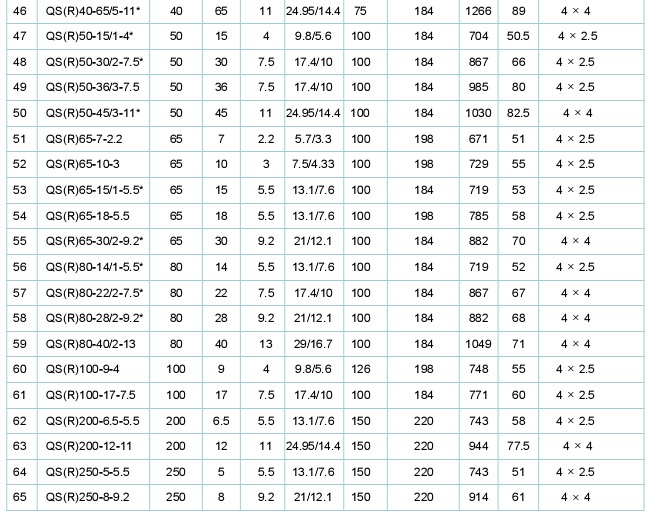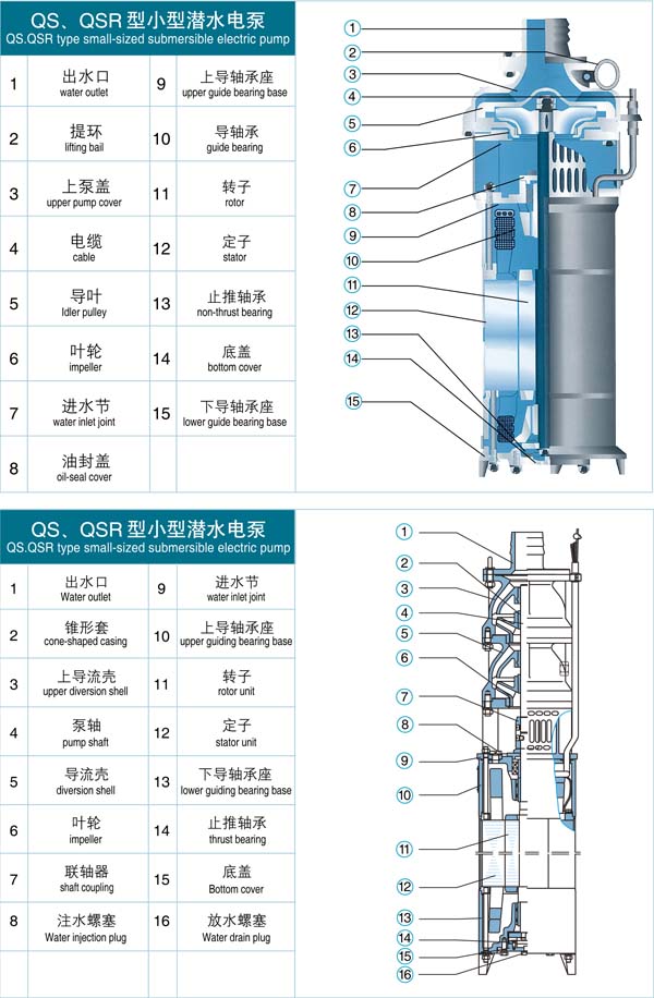 QS型潛水電泵、潛水電機兩大部分組成。電機內腔采用充水式定子繞組采用聚乙烯絕緣尼龍套耐水電磁線,保證電機在水介質中正常工作,定轉子表面涂特殊的耐水涂料,轉子軸伸端有甩砂器,有效的阻止泥沙與水浸入電機腔內,軸承室填充耐水潤滑脂,并用骨架油封保護,有效地防止液體進入軸承室損壞軸承,電機腔內充入清潔的水,起到電機冷卻作用。