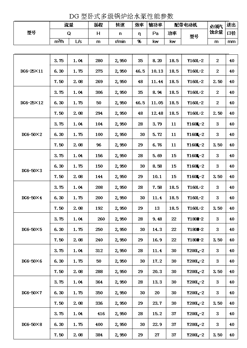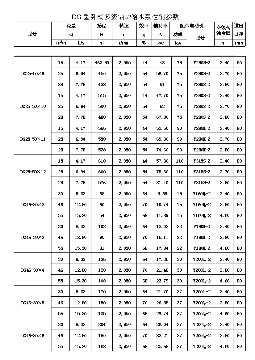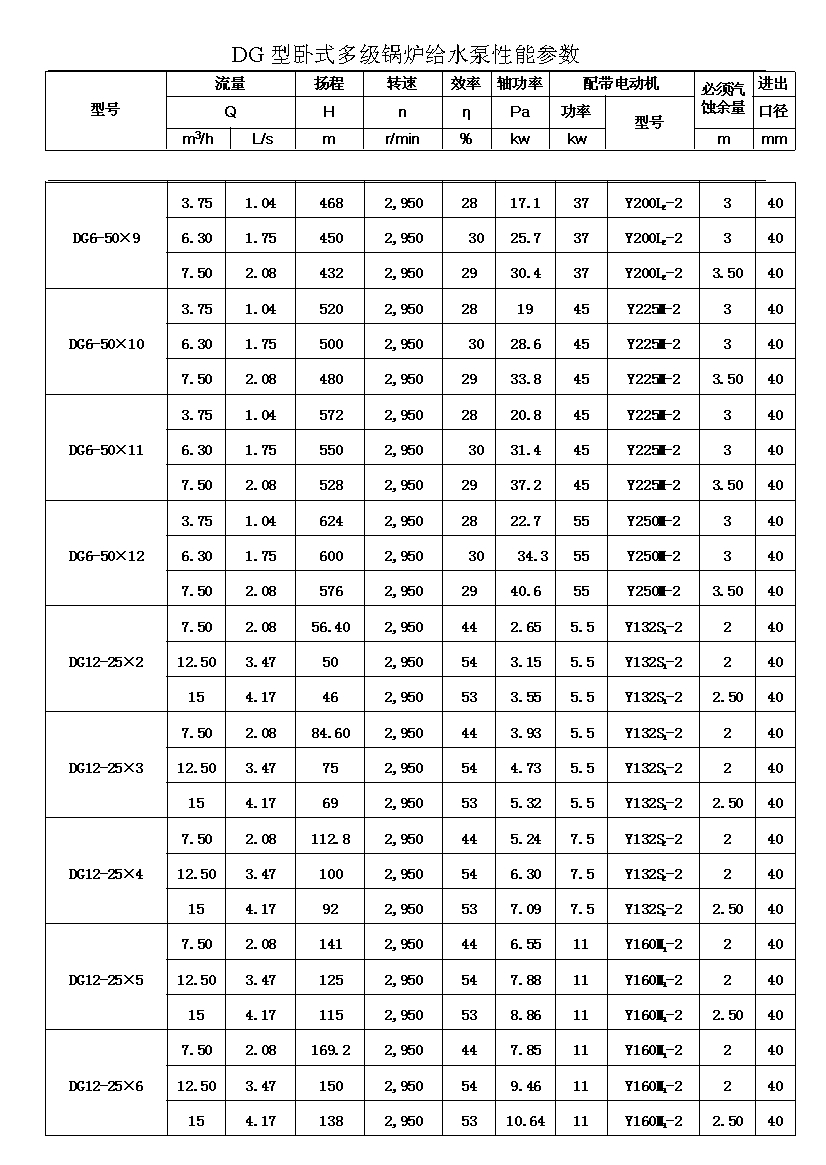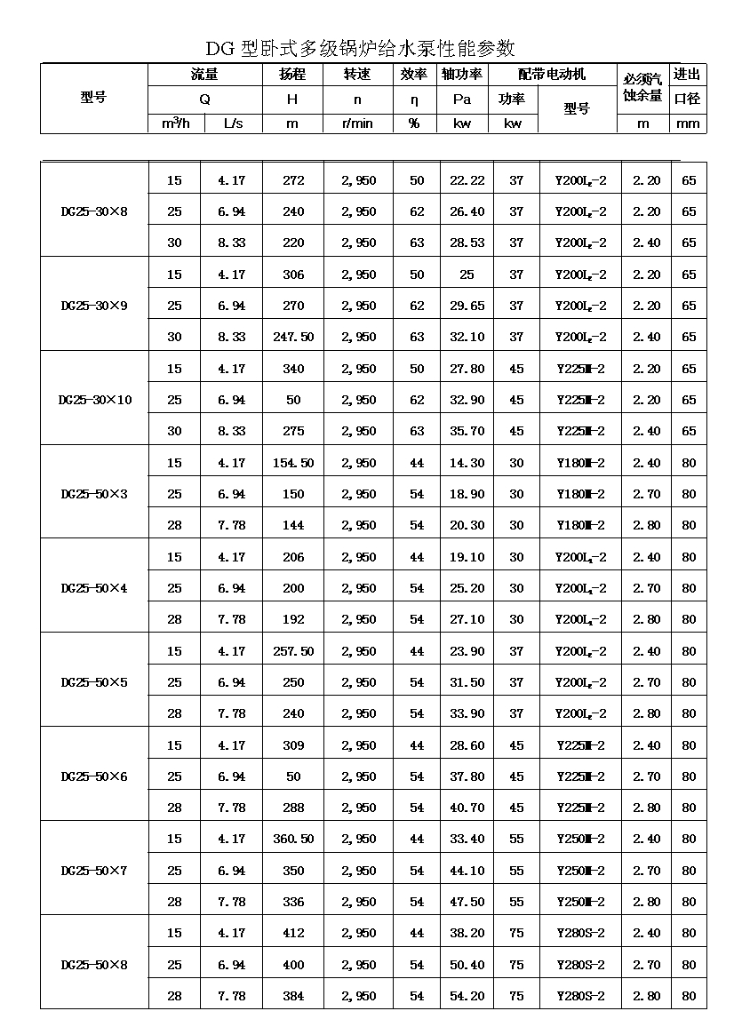 DG型鍋爐給水泵是臥式單級多吸分段式離心水泵。供吸送清水(含雜質量小于1%,顆粒度小于0.1mm)及物理化學性質類似于清水的液體之用。輸送介質溫度不高于105攝氏度,適用于小型鍋爐給水及城鎮供水等場合。DG型鍋爐給水泵屬國家經委、機電部聯合推廣的節能產品,用來代替GC型鍋爐給水泵,其效率平均比GC型高8%,敬請用戶優先選用。