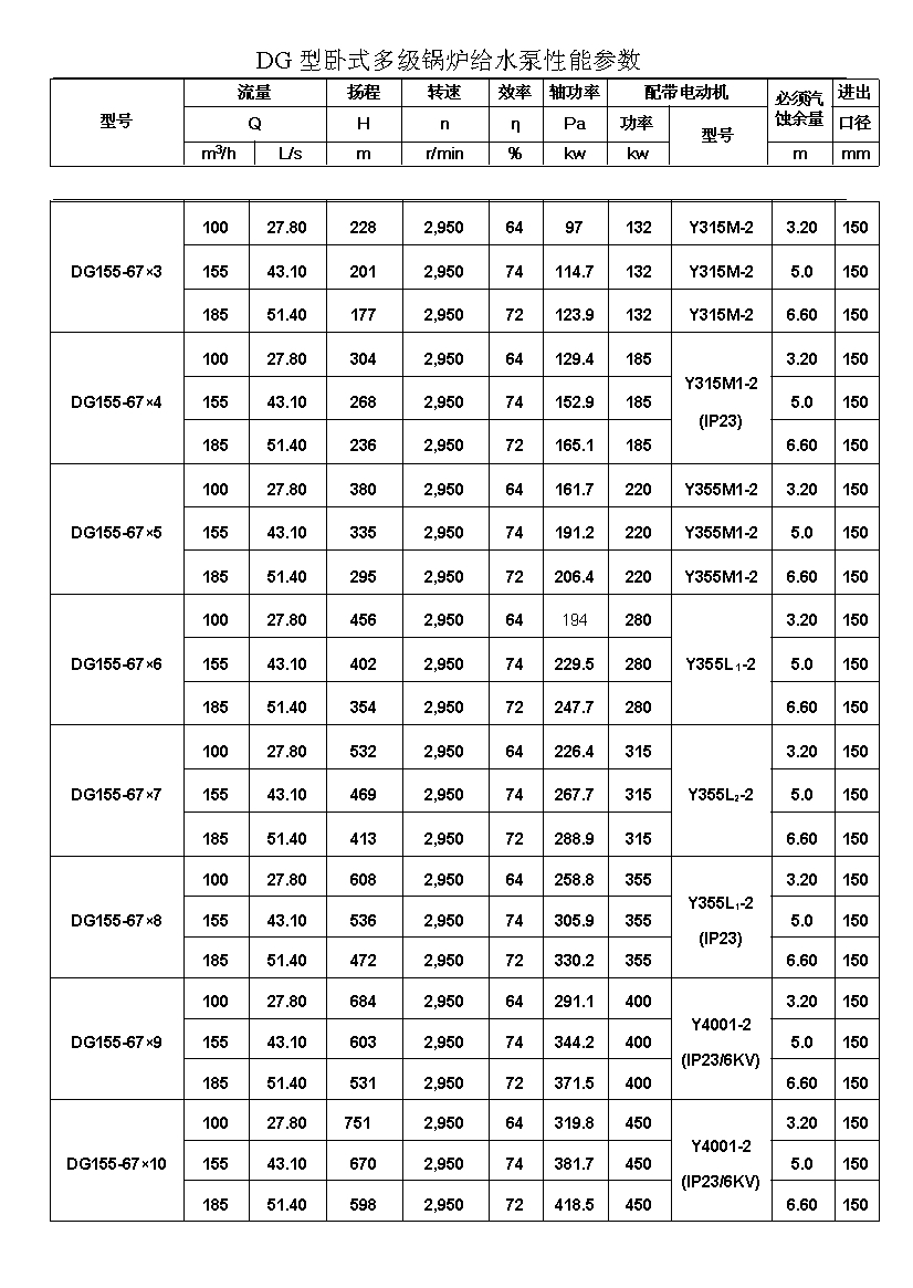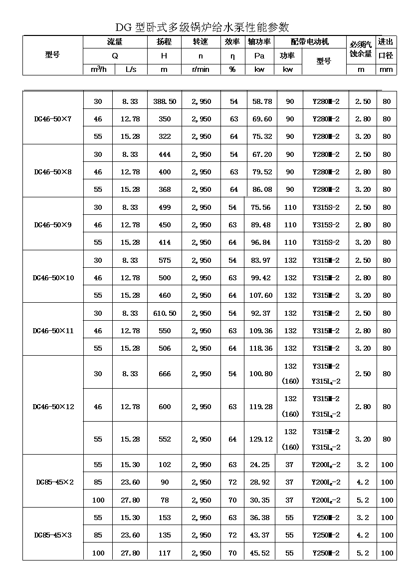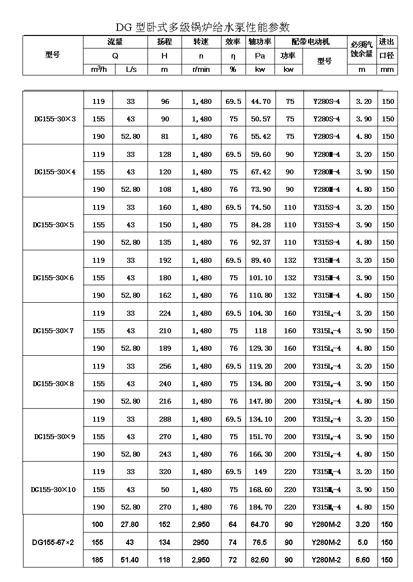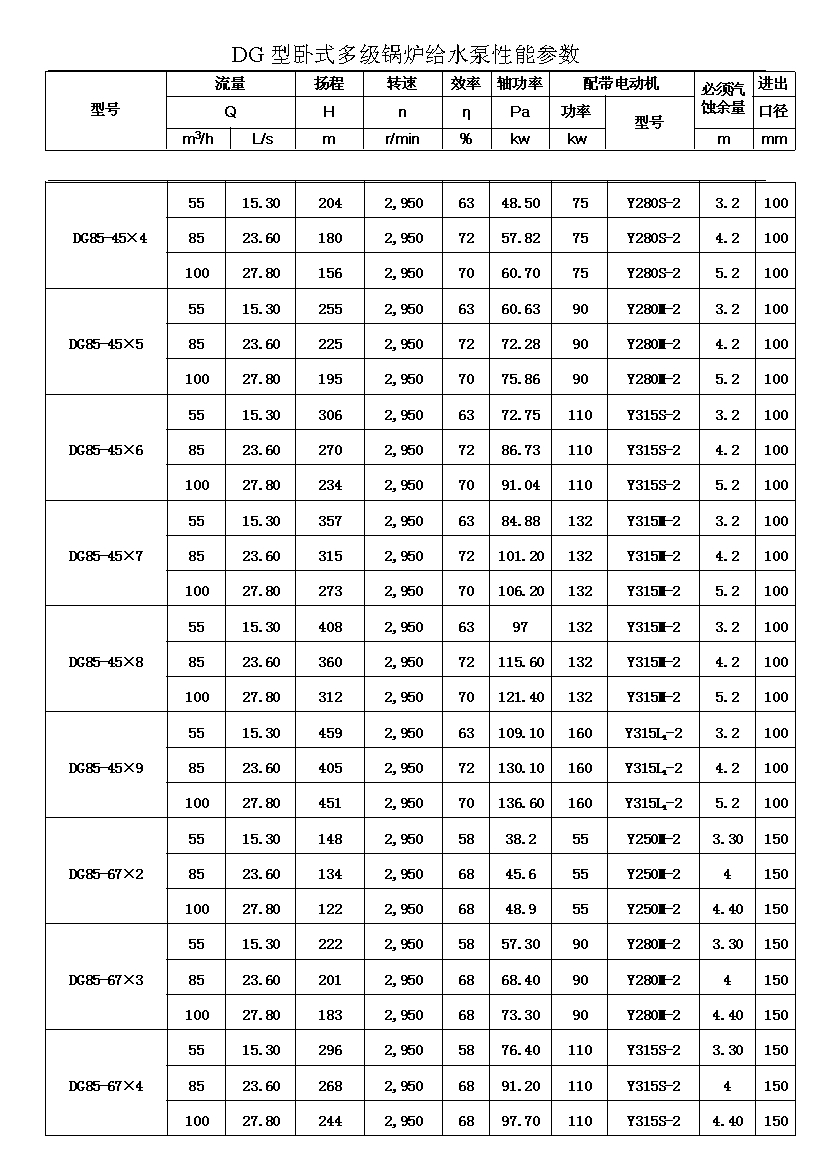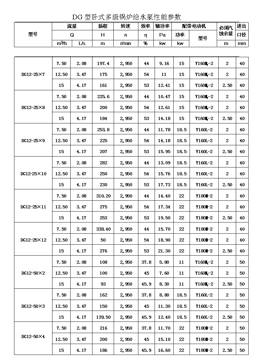 DG型鍋爐給水泵是臥式單級多吸分段式離心水泵。供吸送清水(含雜質量小于1%,顆粒度小于0.1mm)及物理化學性質類似于清水的液體之用。輸送介質溫度不高于105攝氏度,適用于小型鍋爐給水及城鎮供水等場合。DG型鍋爐給水泵屬國家經委、機電部聯合推廣的節能產品,用來代替GC型鍋爐給水泵,其效率平均比GC型高8%,敬請用戶優先選用。