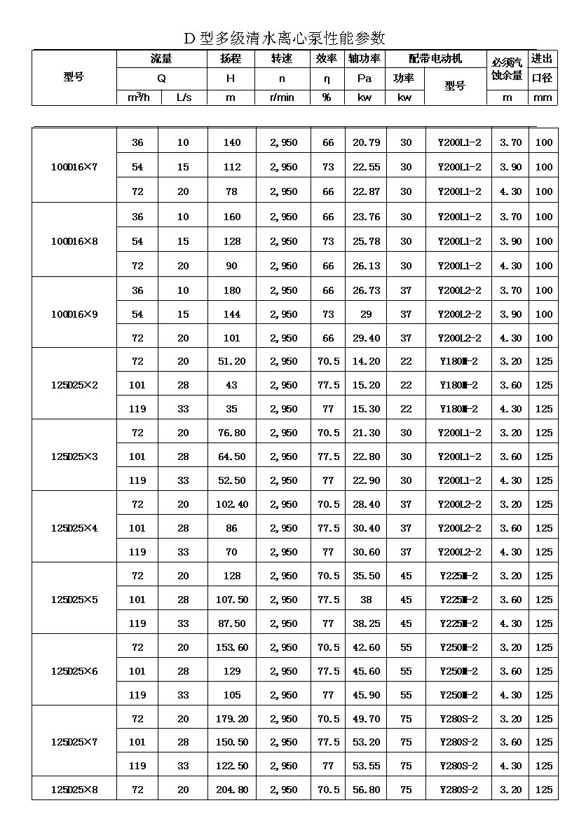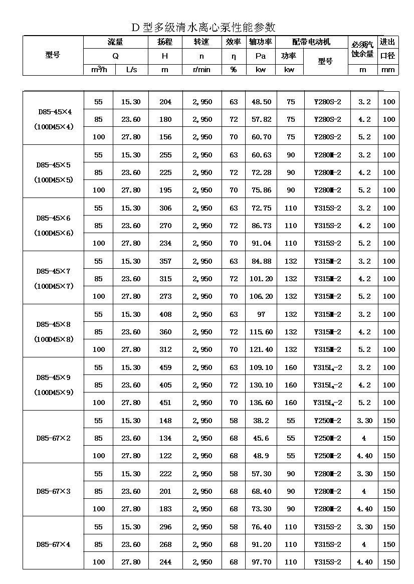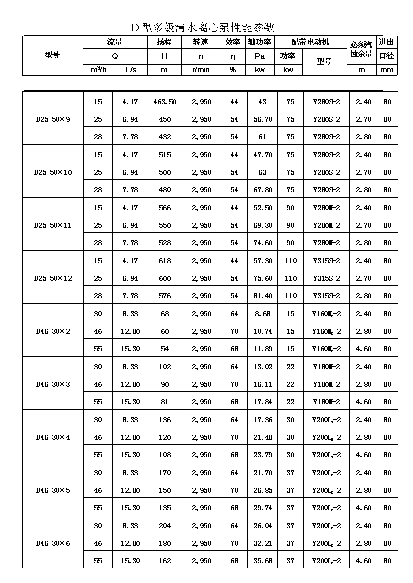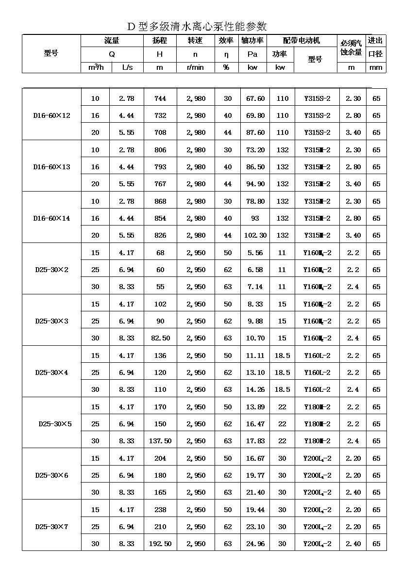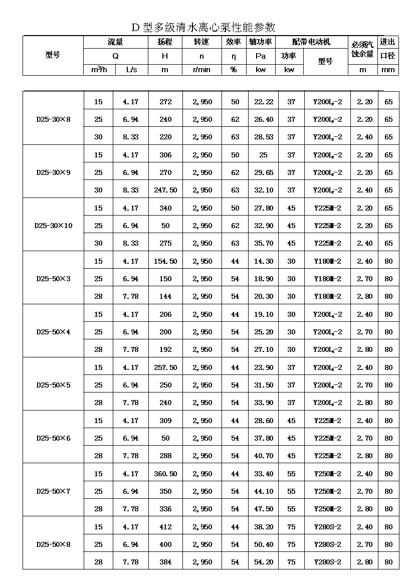 D型泵是單吸多級分段式離心泵,供吸送清水及物理化學性質類似于水的其它液體之用,本型泵的主要性能范圍:單級揚程25米~67米,流量6.3米3/時~450米3/時,液體的***高溫度不超過80℃,適用于礦山、工廠及城市給排水之用。