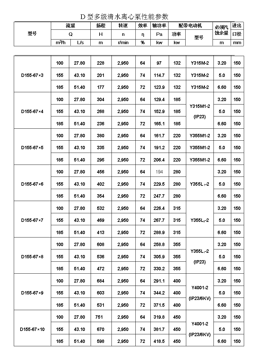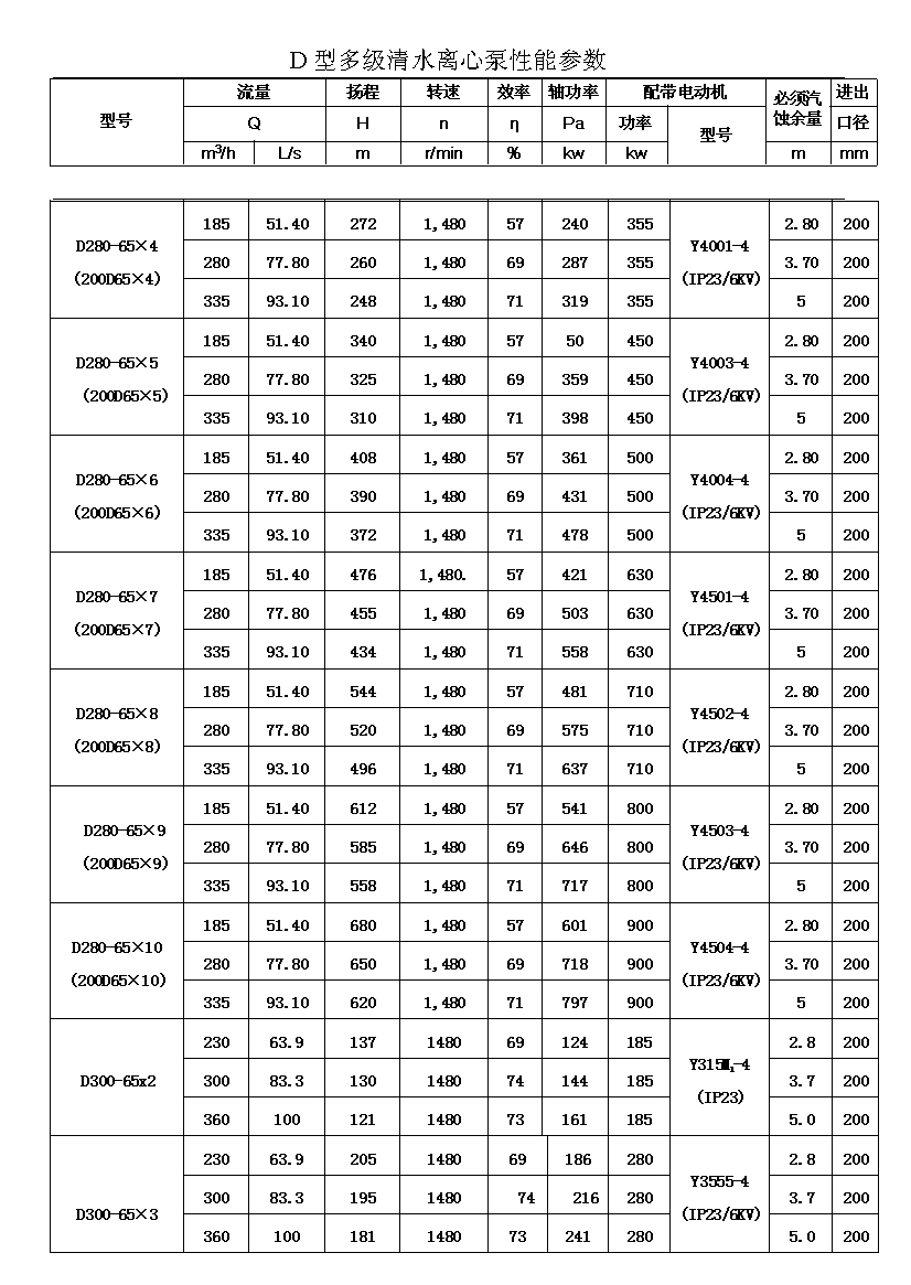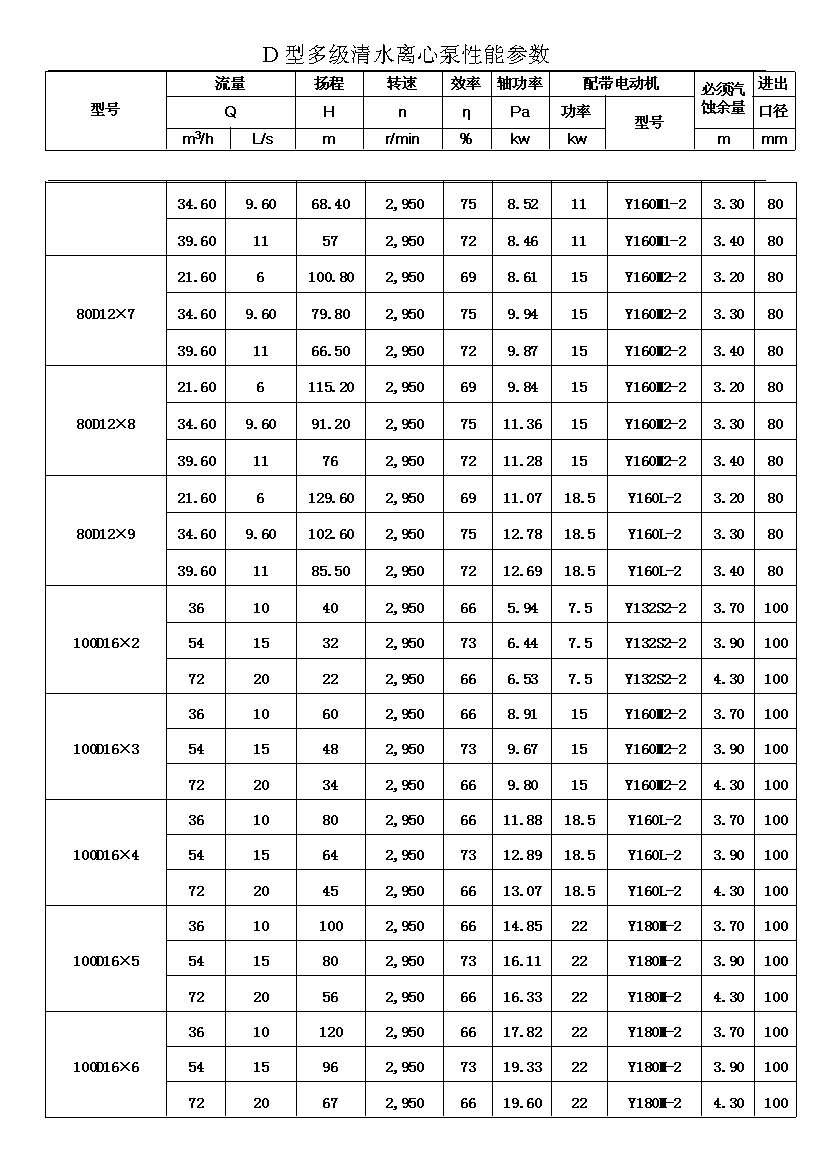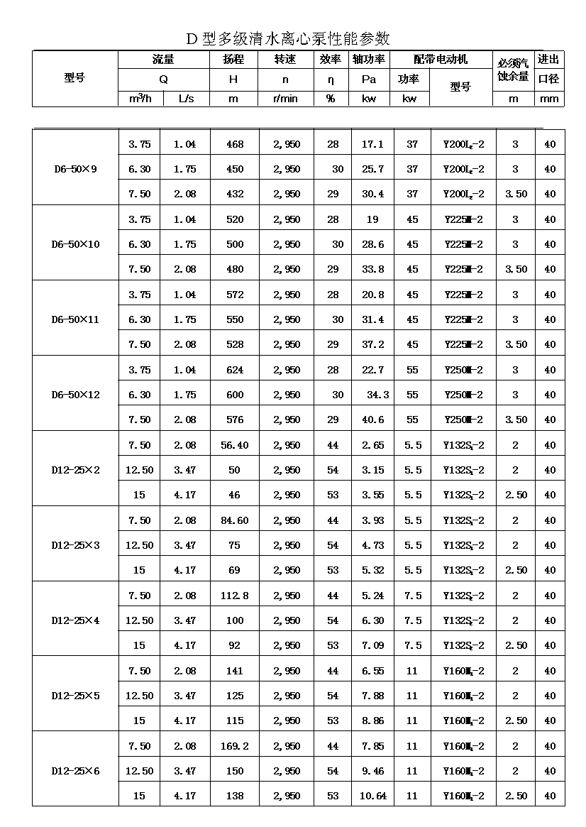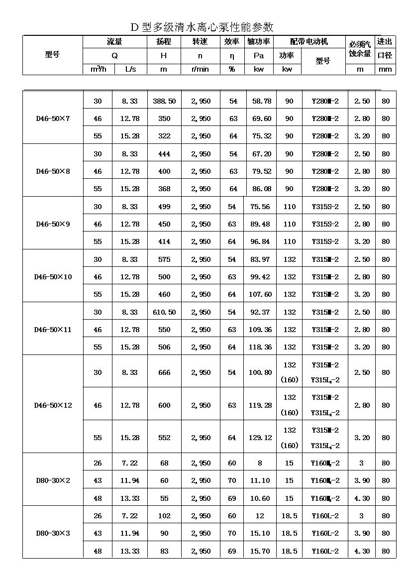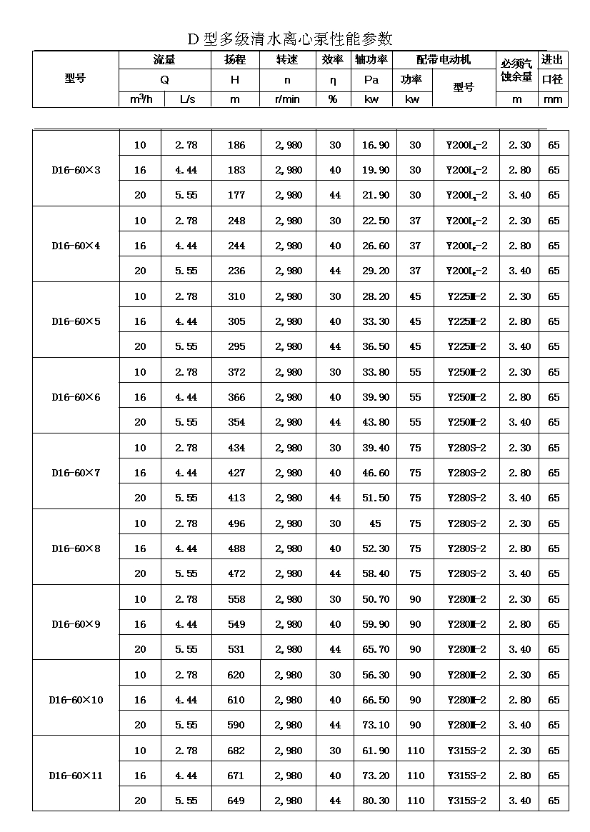D型泵是單吸多級分段式離心泵,供吸送清水及物理化學性質類似于水的其它液體之用,本型泵的主要性能范圍:單級揚程25米~67米,流量6.3米3/時~450米3/時,液體的***高溫度不超過80℃,適用于礦山、工廠及城市給排水之用。